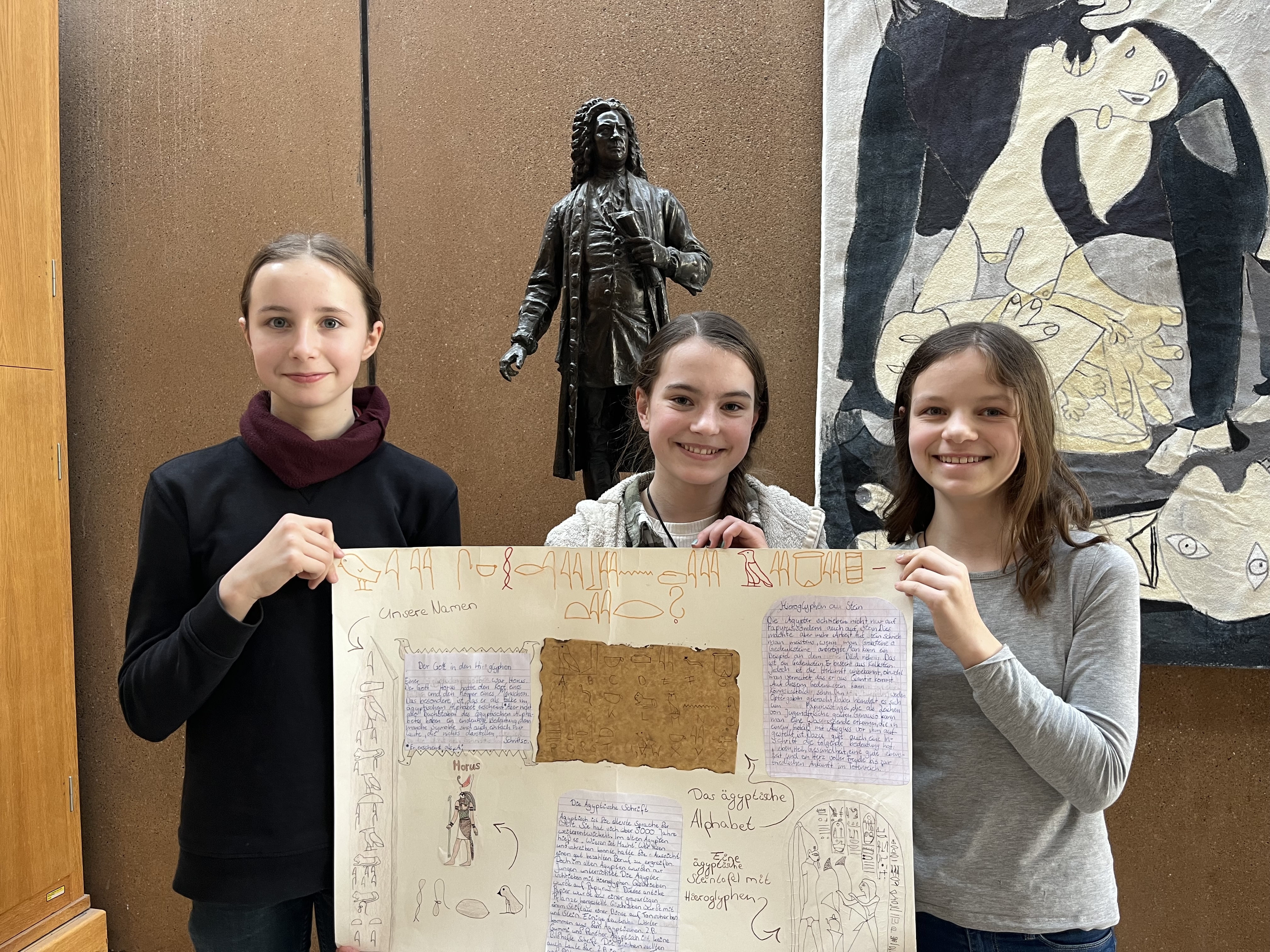 Beim Tag der offenen Tür haben wir zusammen einen Geschichtstalk über das alte Ägypten gehalten. Wir haben uns auf die Spur des geheimnisvollen Gottes Horus begeben und das Rätsel hinter der ägyptischen Schriftart - den Hieroglyphen - gelöst. Um den Vortrag zu veranschaulichen, haben wir ein Plakat verwendet, das wir in der fünften Klasse in Gruppenarbeit im Geschichtsunterricht erstellt haben.